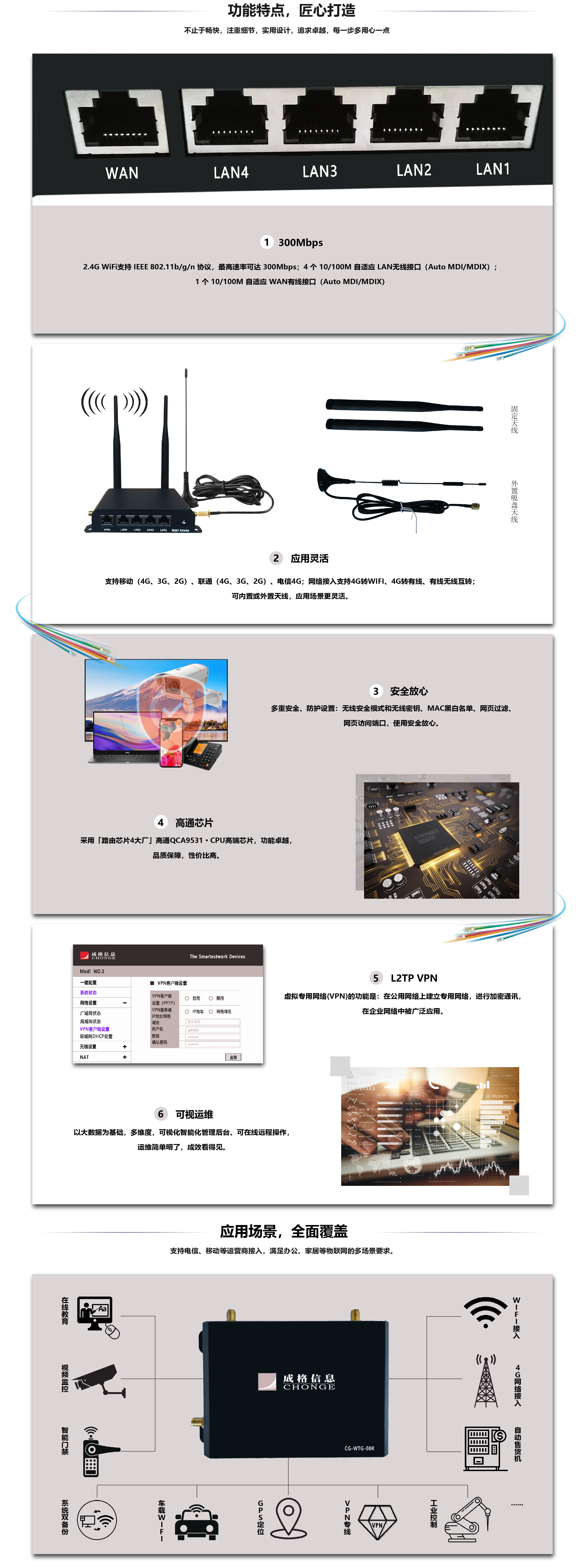 支持IEEE802.11n協議(yì),速率上 <(shàng)限達到(dào)300Mb∞₩↔↔ps,支持國(guó)內(nèi)三大(dà)運營商頻(pín)段接入,4G、WIFI和(hé)♠↓€<有(yǒu)線網絡間(jiān)可(kě)自(zì)如(rú)轉換;優 ‍選高(gāo)增益天線,信号功能(néng)更穩定;可(kě)選用(yòng)固定天線和 ∞(hé)外(wài)置吸盤天線,接入方式更靈活,适用(yòng)更多(duō)應$₩★ε用(yòng)場(chǎng)景;穿牆能(néng)力更↔♥γ強,覆蓋範圍更廣。