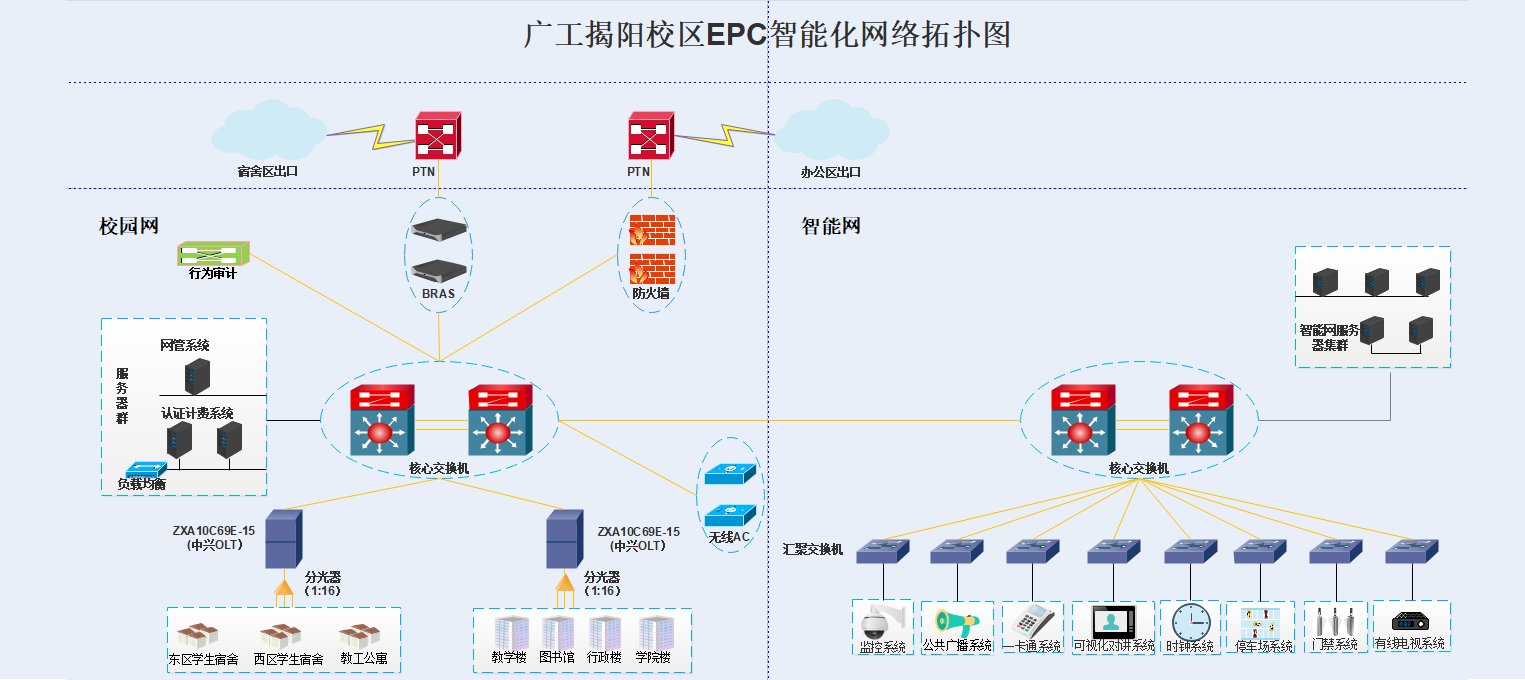(1)一(yī)網承載多(duō)業(yè)務,滿足視(shì)頻(pín)監控、數(sh≤ù)字廣播、無線網絡、教學、安防、辦公和(hé)物(wù)聯網等使用(yòng);
